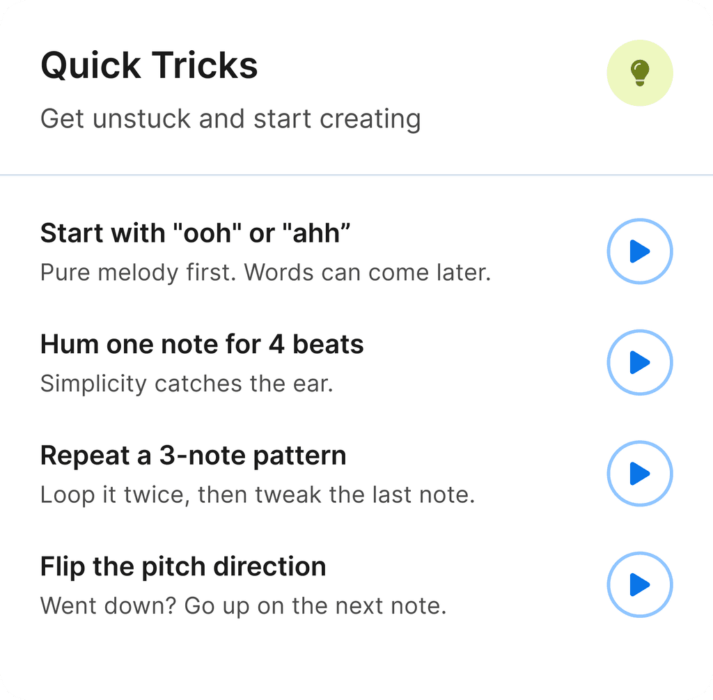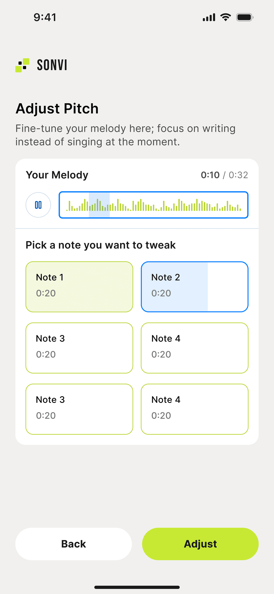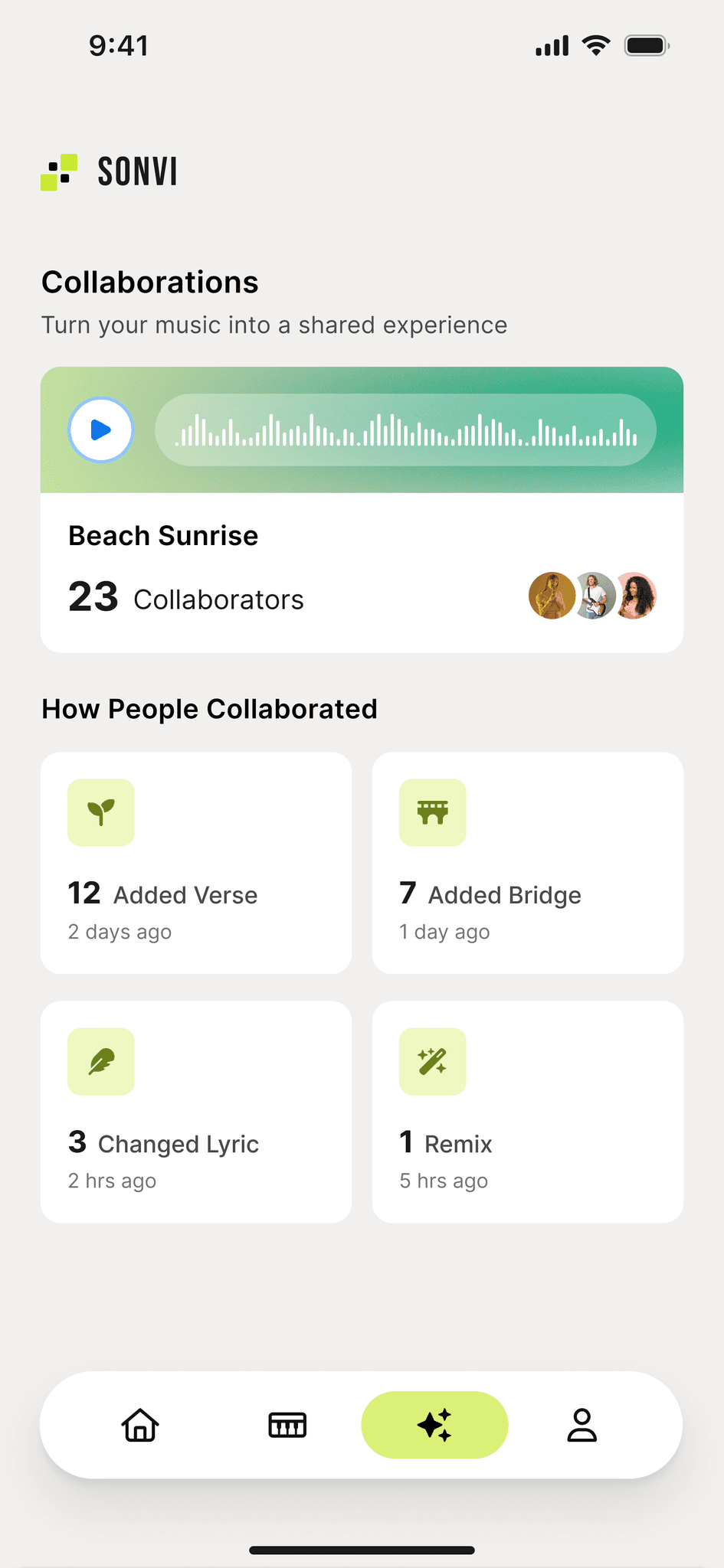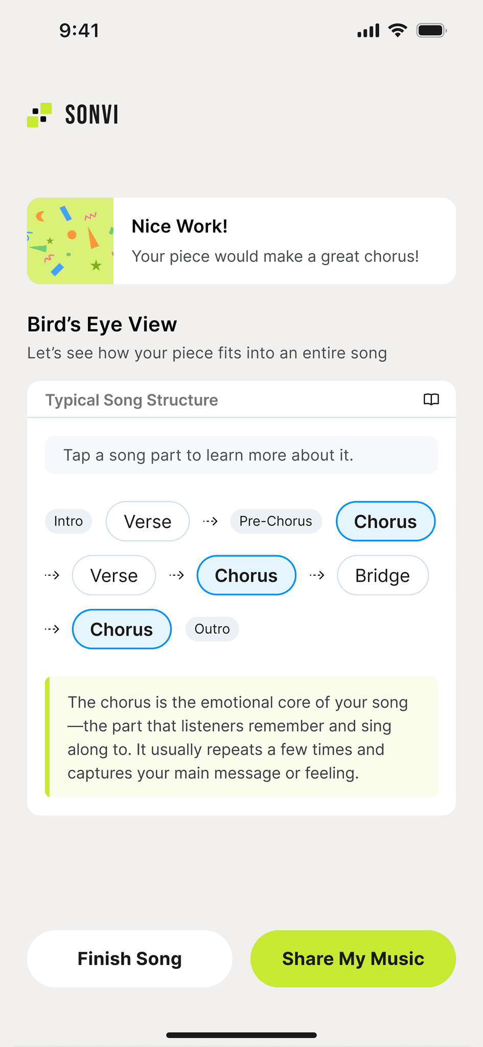 Sonvi helps amateur songwriters spark their creativity with intelligent assistance, bite-sized music education, and seamless collaboration.