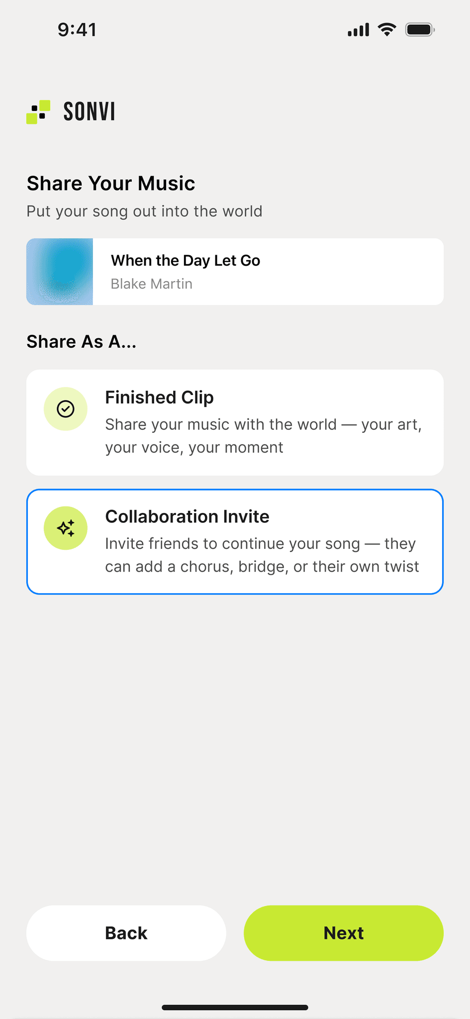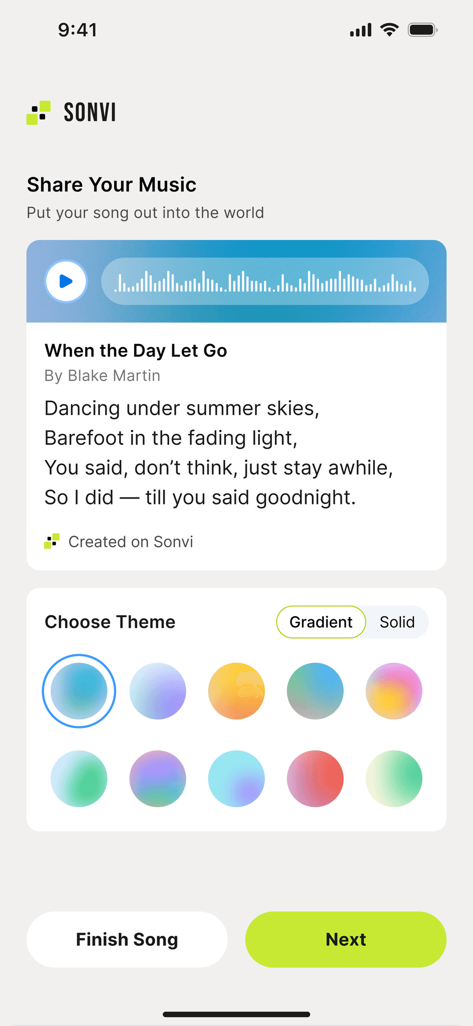 Showcase your completed songs to the Sonvi community and get feedback from fellow songwriters.